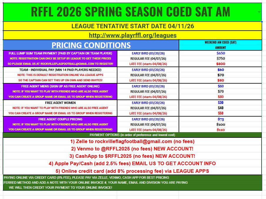 If you want to register as a team, please have your captain email us at rockvilleflagfootball@gmail.com ASAP and we will help create the team and make it easy for the players to register via captain invites.