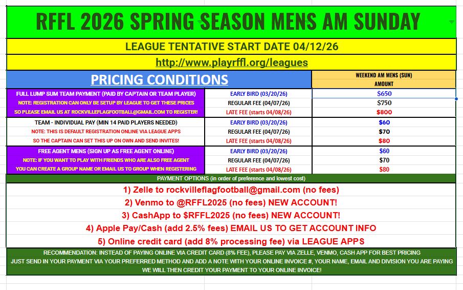 If you want to register as a team, please have your captain email us at rockvilleflagfootball@gmail.com ASAP and we will help create the team and make it easy for the players to register via captain invites.